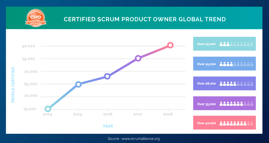 With many companies realizing the need of Product Owner for their product management, there is an increasing number of people getting certified as CSPO. The below chart shows how the number of people getting CSPO certificate is increasing year by year.