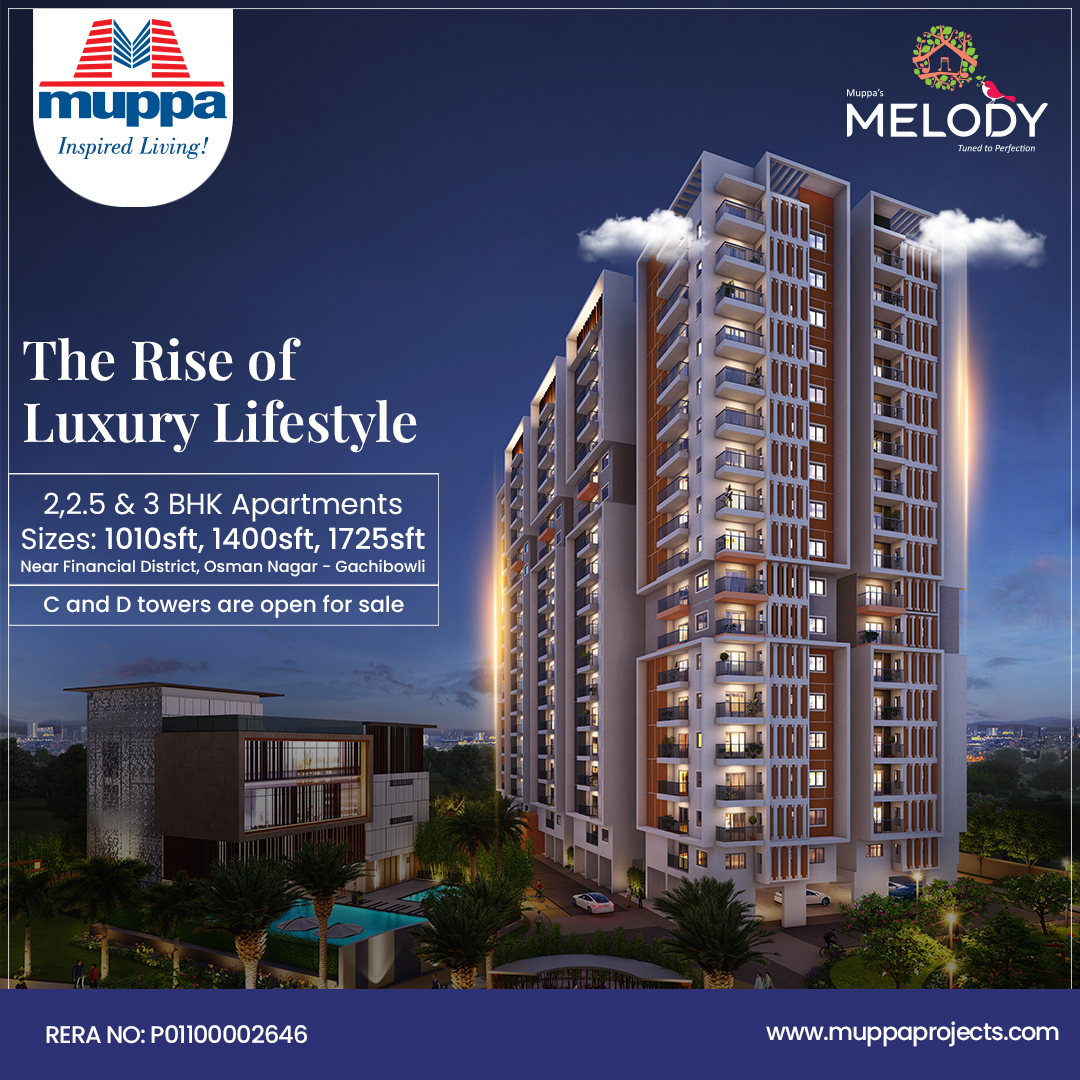 Muppa’s Melody is a Gated Community Luxury Apartment offering 1054 exquisitely designed 2, 2.5 & 3 BHK flats. It is spread over 8.33 acres, across 7 Blocks, each rising to 17 floors. Melody is located in Tellapur – Osman Nagar – Gachibowli extension, in close proximity to Outer Ring Road and well-connected to Gachibowli and the international airport. The flats are perfectly-designed to offer great ventilation, and wonderful views and boast pollution-free surroundings.