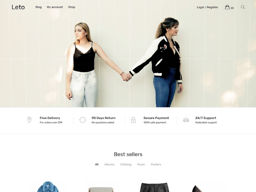Nothing quite compares to a simple yet straight-to-the-point website. Leto is a great example of a free WooCommerce WordPress theme that can cater to any kind of shop you may have in mind with its easy-to-use and basic functionalities.