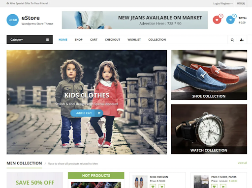 eStore is a free WooCommerce WordPress theme with a design that does all the work to ensure your customers have their eyes glued to it. It also comprises RTL language support and allows you to use a custom logo.