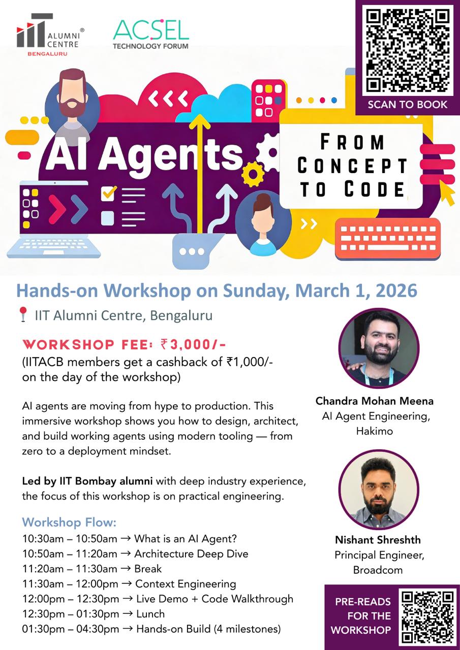 Stop watching demos—start building. This workshop bypasses the hype to focus on the architecture and implementation of autonomous AI agents. Led by IIT Bombay alumni, you will move from theory to a deployment-ready mindset in a single day.
