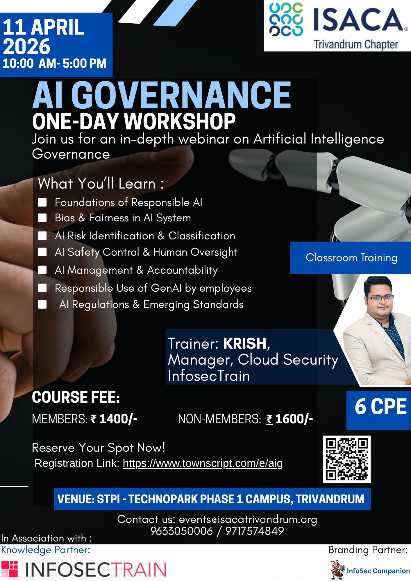 The AI Governance Workshop by ISACA Trivandrum Chapter (April 11, 2026, STPI Technopark) delivers a comprehensive view of AI governance from fundamentals to enterprise implementation.