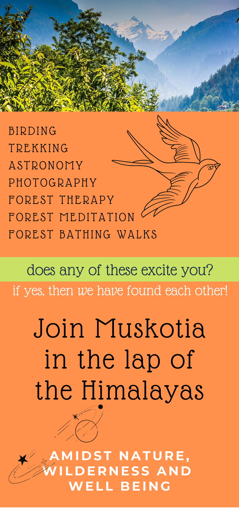 To confirm your participation and get further details, kindly whats app your name and email to 7599741949 or email to nature@muskotiaretreat.com. You can also speak with BACHI ON 9536567986 to know more about this retreat