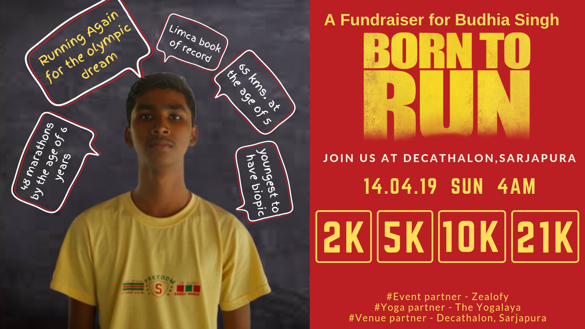 Born To Run - A Fundraiser For Budhia Singh, If you are a runner you know Budhia, he is the world's youngest marathon runner (just google). He had created history by running 65Kms at the age of 5 and registered his name in the Limca Book of Record. By the age of 6 he had completed more than 40 marathons. But his life was full of odds and it was so inspiring that, they made a Bollywood movie called "Budhia singh - Born To Run".