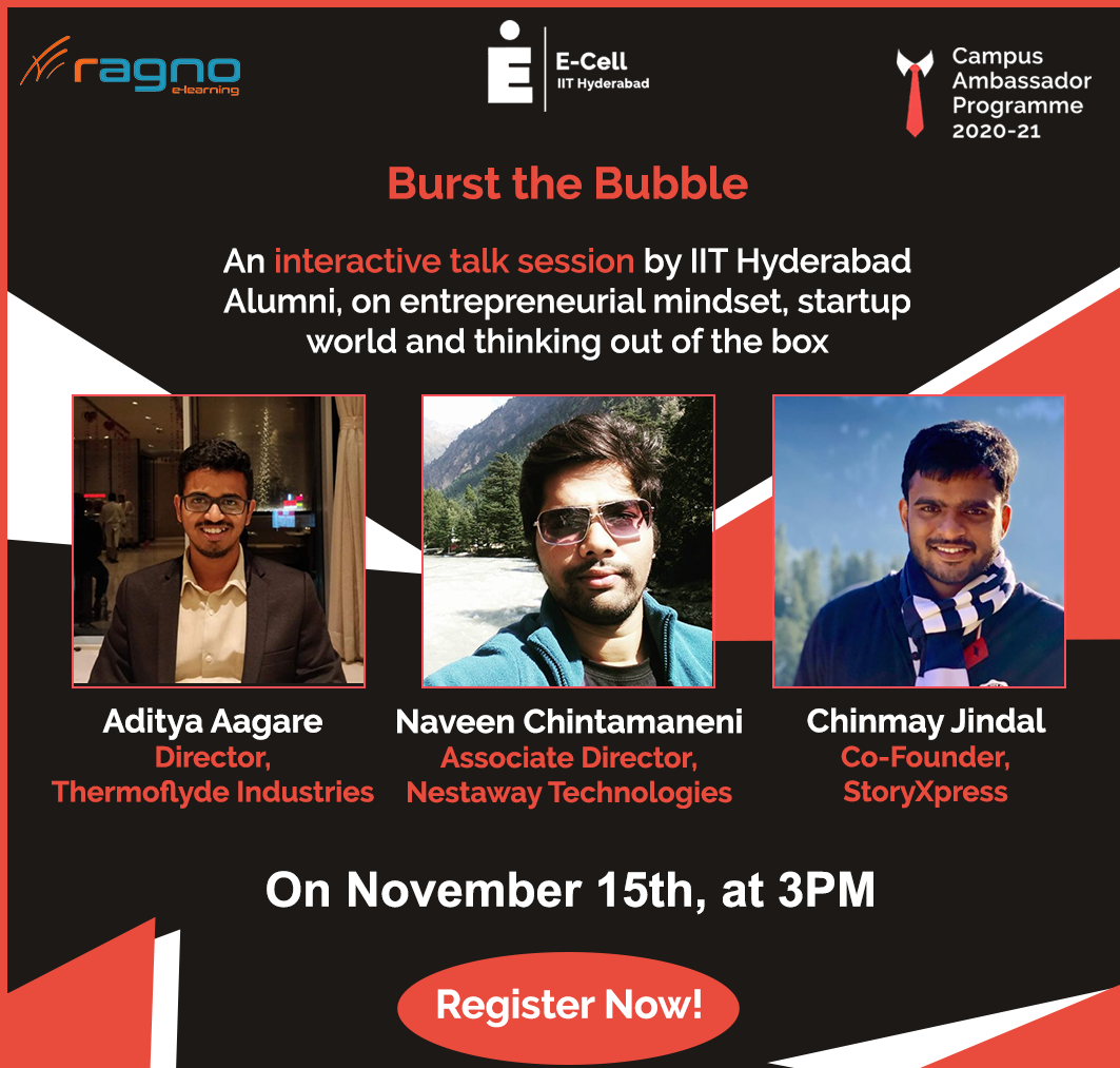 E-Cell IIT Hyderabad presents to you: "Burst the Bubble" - an Interactive Panel Discussion session with the alumni of IIT Hyderabad. The discussion will be on the current startup scenario and market, the will of building a product of your own from a student's point of view, and many more topics on this niche.