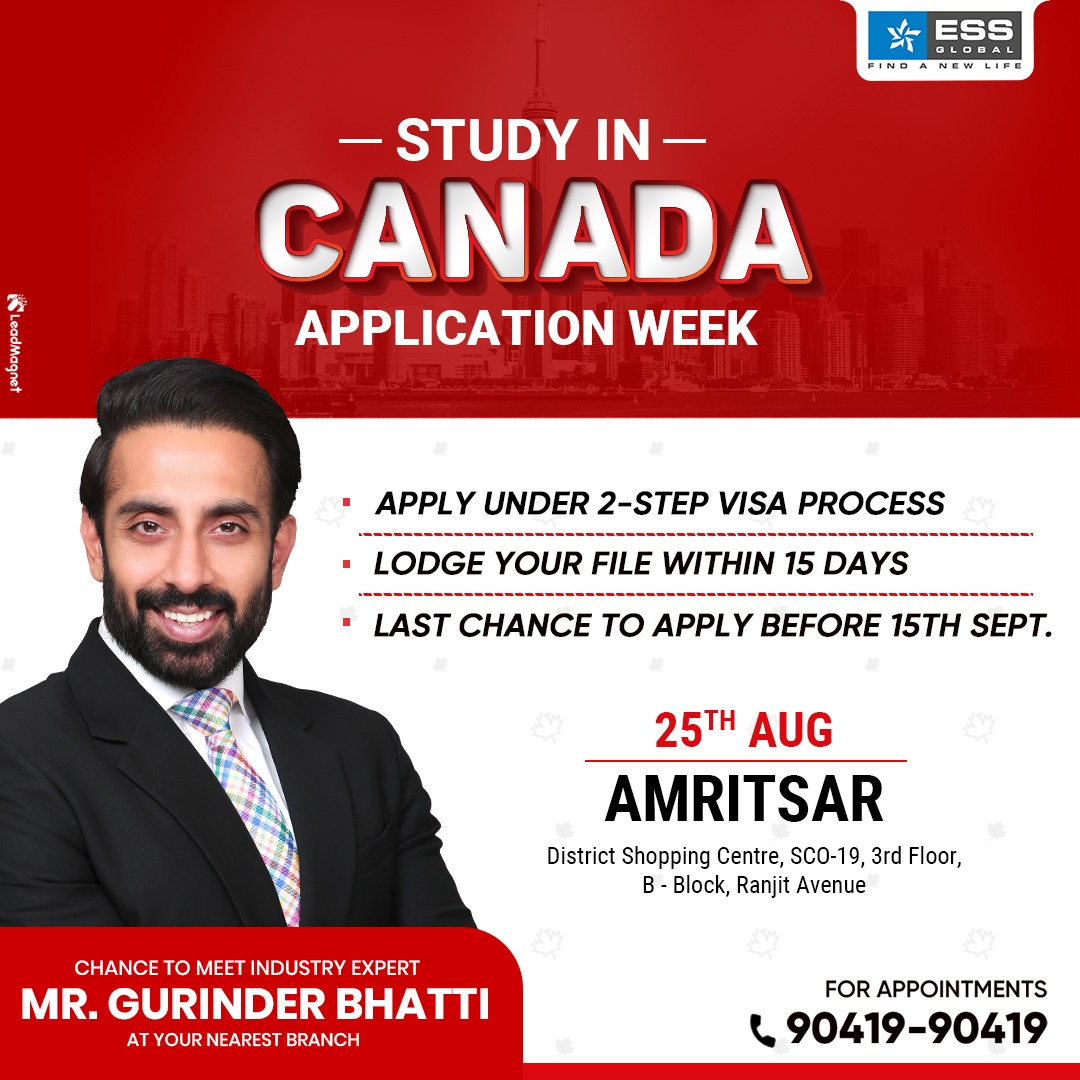 Studying in abroad is a dream of many. For aspirants who are keen about education in their favourite countries ESS Global is organizing Study in Canada Application Week on 25th August in Amritsar to welcome the students for appropriate study abroad assistance.
