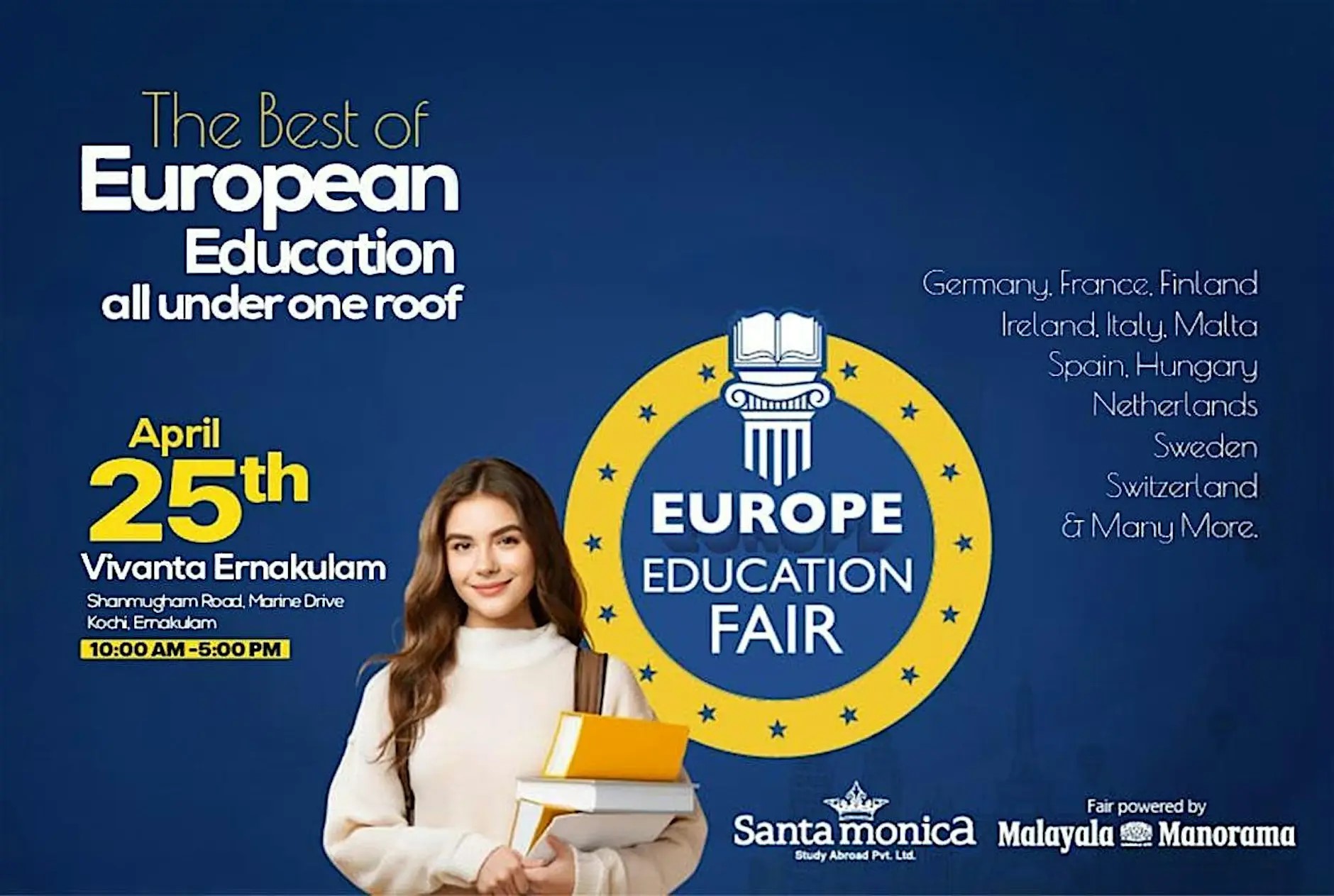Attend the exclusive Europe Education Fair by Santa Monica Study Abroad Pvt. Ltd. in Kochi. Connect with representatives from leading universities across Europe and discover study options in countries like Germany, France, Ireland, Italy, and more. Receive expert advice on courses, admissions, scholarships, and visas—all in one place. Take the next step toward your global education journey.