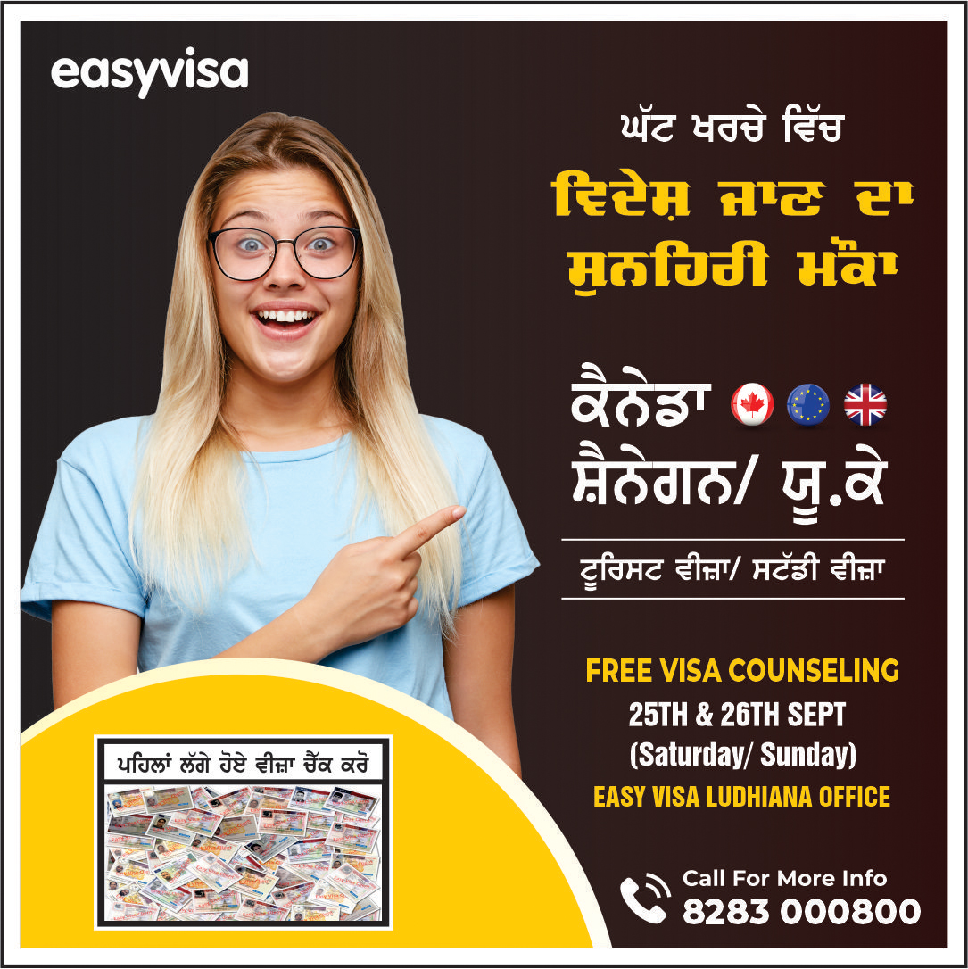 Free One to One Visa Counseling ਲਈ 25\26 ਸਤੰਬਰ ਨੂੰ ਮਿਲੋ Easy Visa ਦੀ Expert Team ਨੂੰ ਸਾਡੇ ਲੁਧਿਆਣਾ ਦਫਤਰ ਵਿਚ :