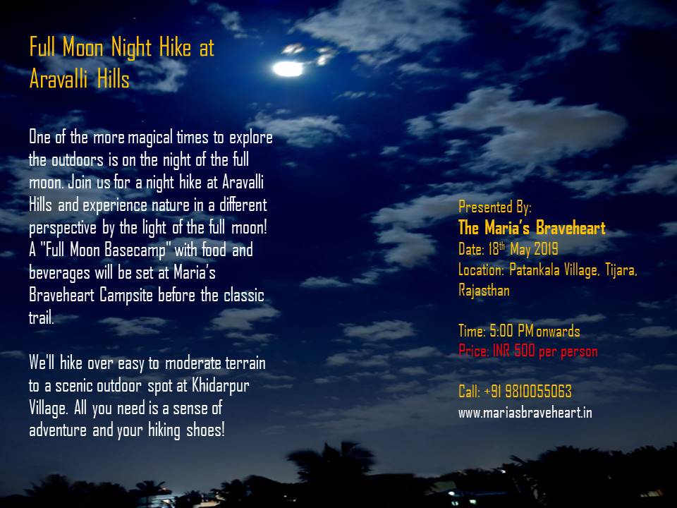 If you have a special connection to the moon, join us on a guided 2 hour walk along the Aravalli trails by the light of the full moon on 18th May 2019. It’s a Buddha Purnima (full moon) and the most sacred day in Buddhist calendar. They say that the magical energy of full Moon symbolises growth, widen your horizons and raises your conscious to take up new learning endeavour. This tranquil hike encourages reflection and connection with nature as we bring you a dedicated full moon hike no agenda, just friends and families out to experience the simple “good stuff” of life.