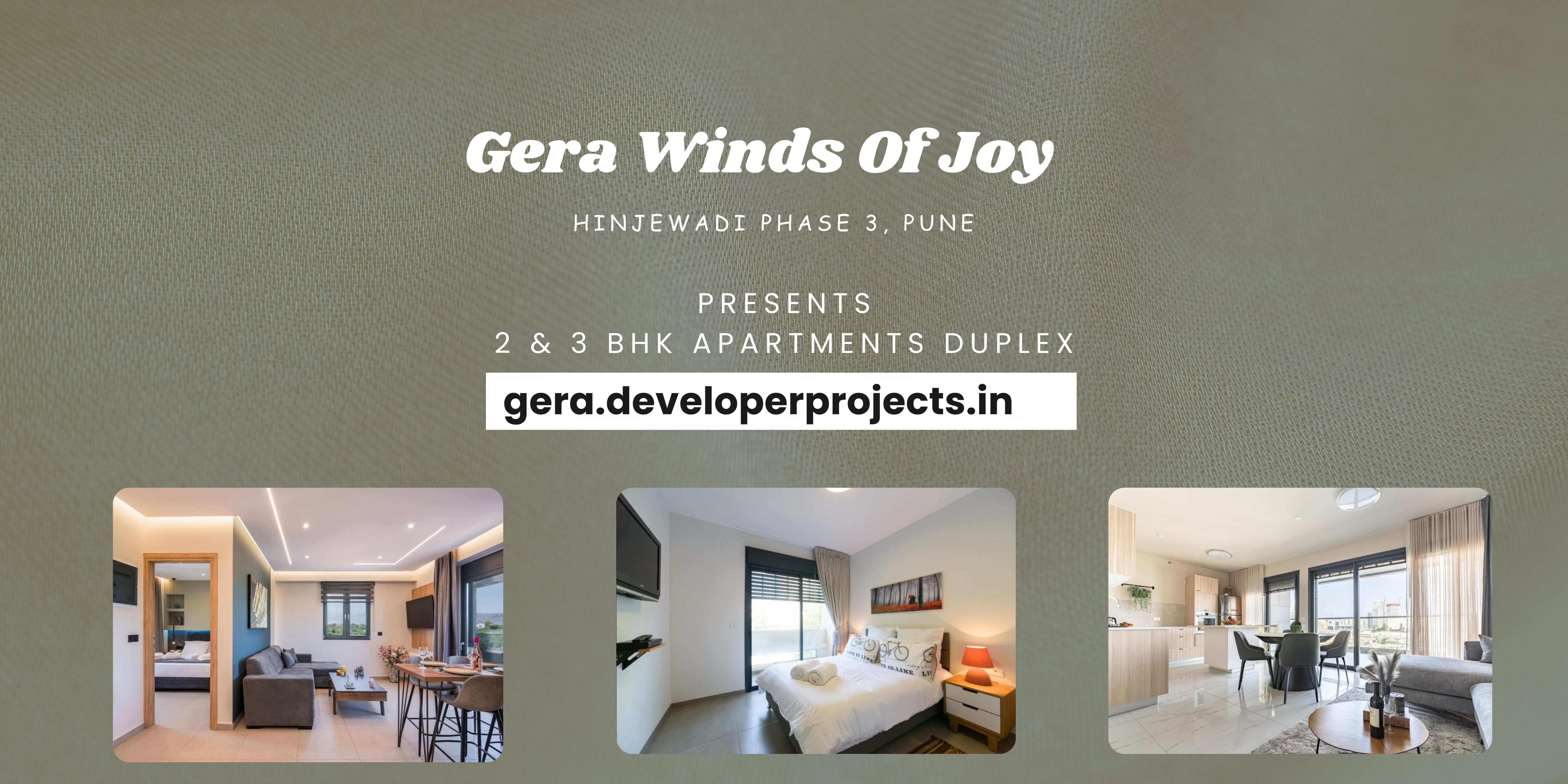 Gera Winds of Joy is a spacious residential project located in Hinjewadi Phase 3 Pune, that offers a blend of comfort, luxury and modern amenities. With a focus on providing spacious living space, the project comprises 2 and 3 BHK duplex apartments that are designed to cater to various needs. It provides endless opportunities for you and your children to research, understand and develop.