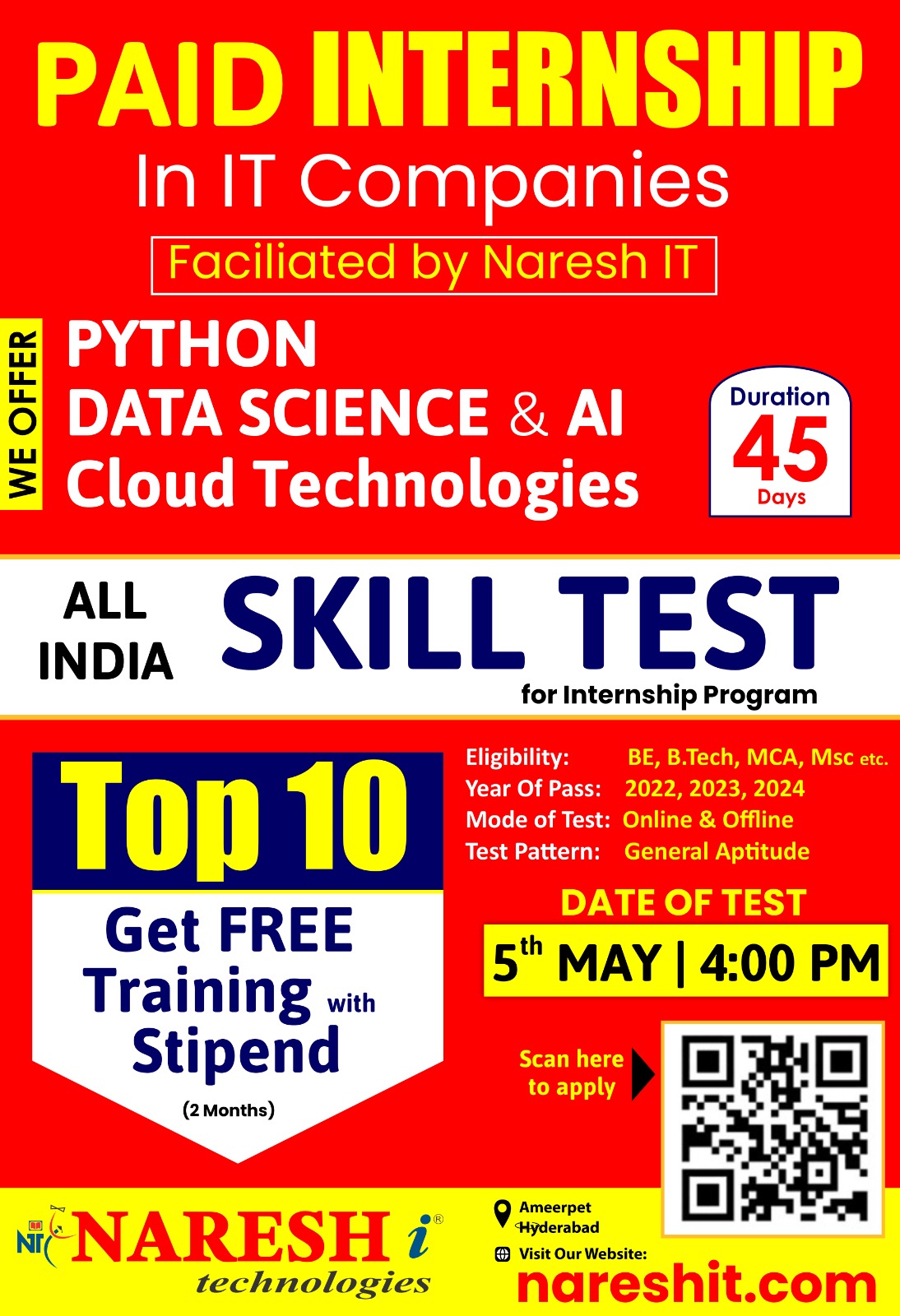 Grab Paid Internship Offers in IT Companies through Naresh IT Skill Test.