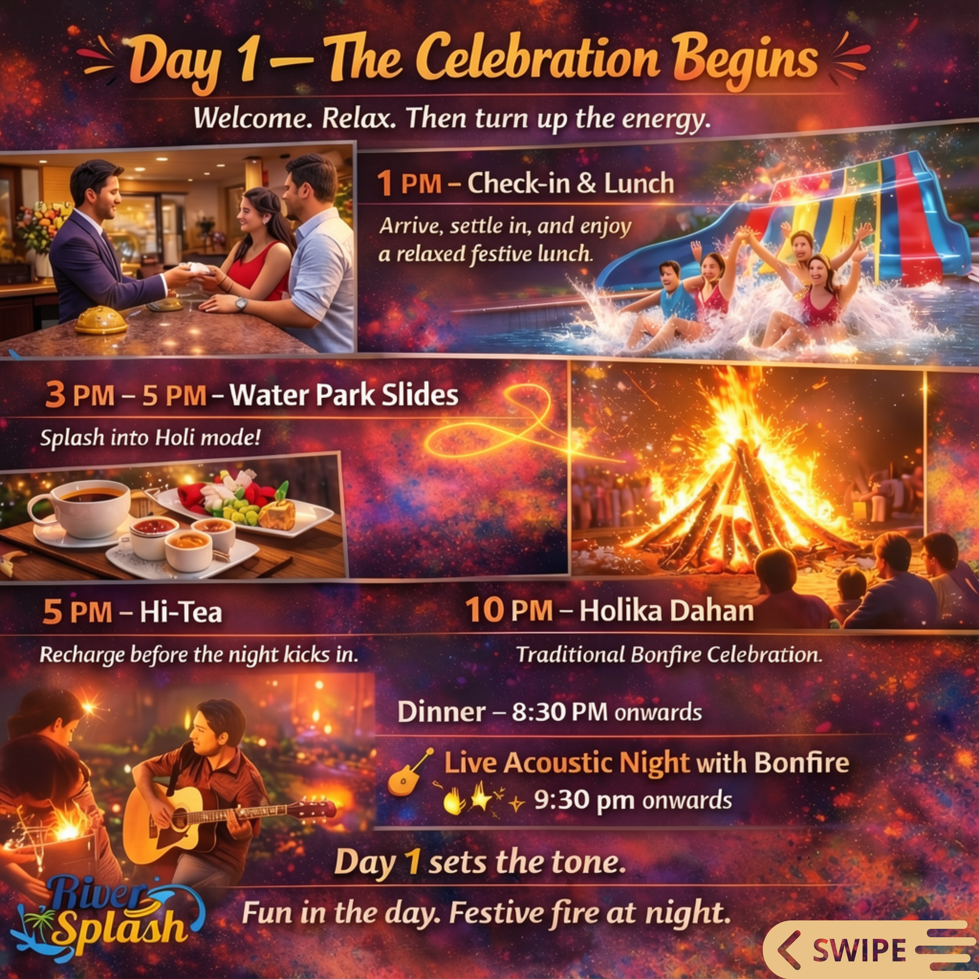 Celebrate Holi like never before with 2 days of colors, music, water park fun, and festive energy — all at one destination near Mumbai and Pune.