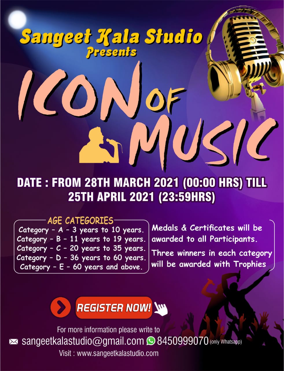 - For more information regarding the competitions, Visit https://www.sangeetkalastudio.com or write to sangeetkalastudio@gmail.com or Whatsapp Number – 8450999070.