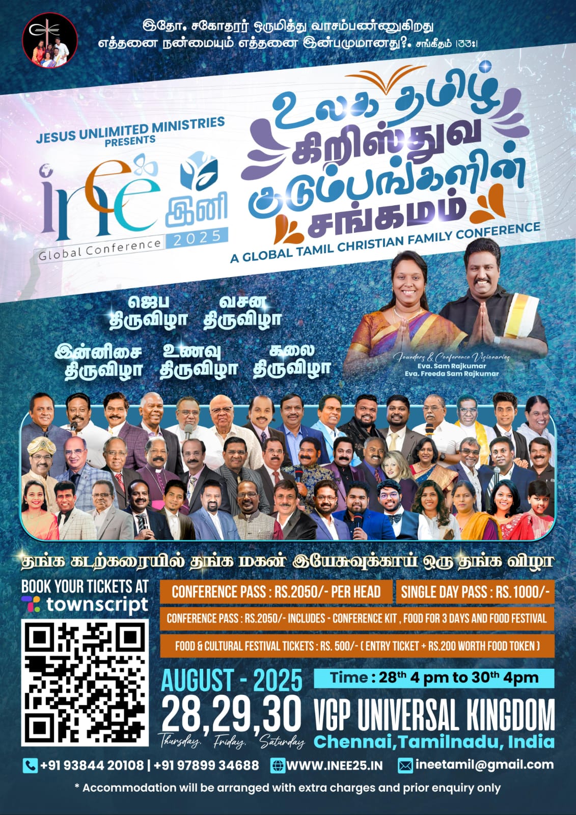 INEE 2025 (இனி – Henceforth) is a spiritually enriching 3-day global conference designed to Rejuvenate, Restore, and Rebuild Tamil Christian families in Christ. Hosted by Jesus Unlimited Ministries, this conference is a divine platform for worship, fellowship, biblical teaching, cultural celebration, Healing, Revival & Prophetic Impartation —unifying families.