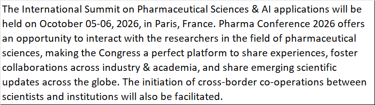 The International Summit on Pharmaceutical Sciences & AI applications will be held on Ocotober 05-06, 2026, in Paris, France. Pharma Conference 2026 offers an opportunity to interact with the researchers in the field of pharmaceutical sciences, making the Congress a perfect platform to share experiences, foster collaborations across industry & academia, and share emerging scientific updates across the globe. The initiation of cross-border co-operations between scientists and institutions will also be facilitated.