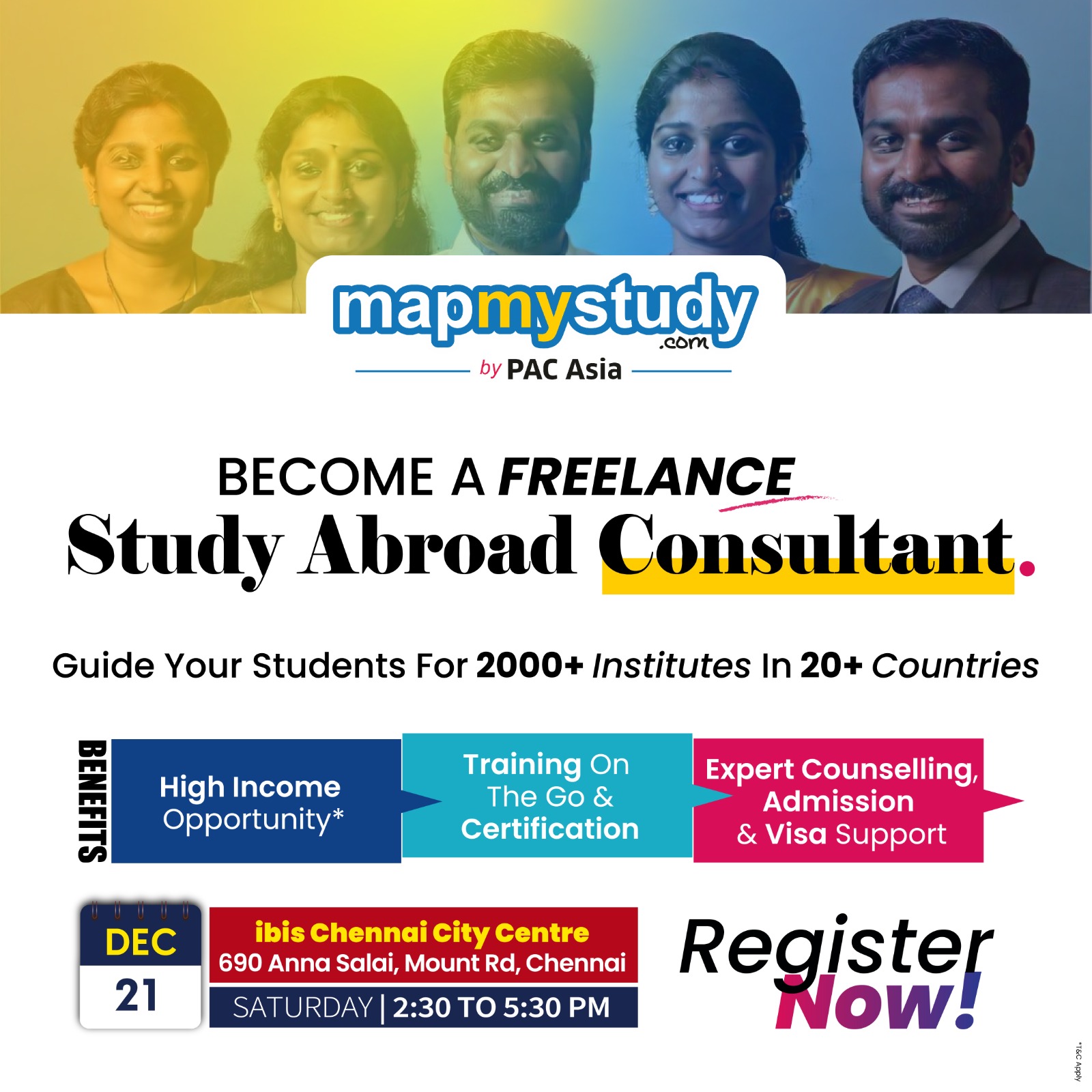 We warmly invite you to an exclusive session designed for those looking to build a career as freelance Education Consultants or Study Abroad Experts. Join us on 21st December 2024, from 2:30 PM to 5:30 PM, at ibis Chennai City Centre, 690 Anna Salai, Mount Rd, Chennai.