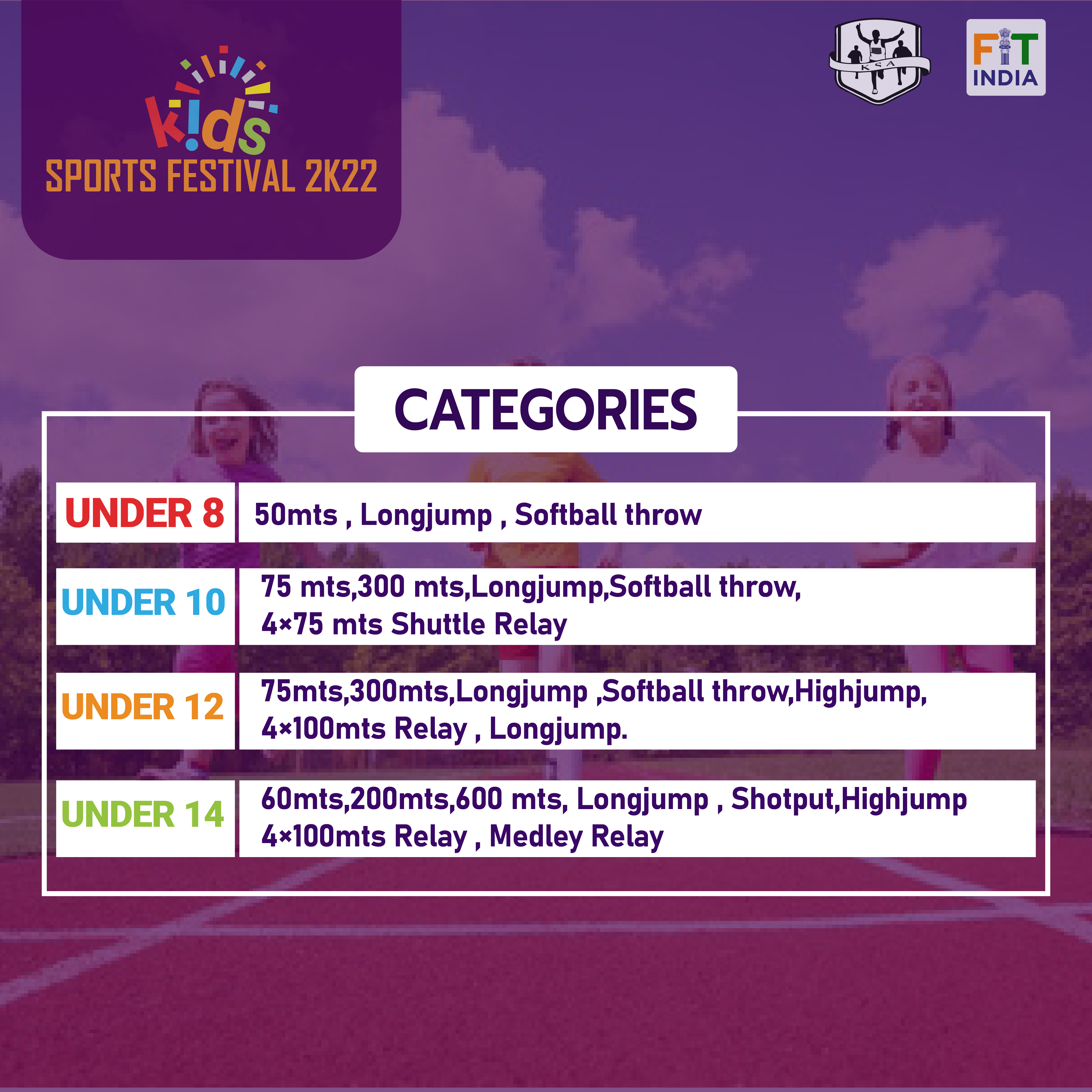 75mts , 300mts , longjump , softball throw, 4×75mts shuttle relay .