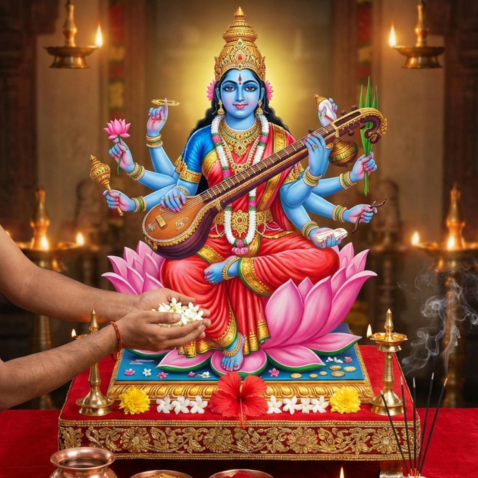 Shodasa Upachara Puja involves offering sixteen traditional services to the Goddess—such as asana, padya, arghya, deepa, naivedya, and pushpa—symbolizing complete devotion through body, mind, and soul. This detailed worship honors Matangi as the Queen of knowledge, music, arts, learning, and refined expression, pleasing Her through disciplined and heartfelt reverence.