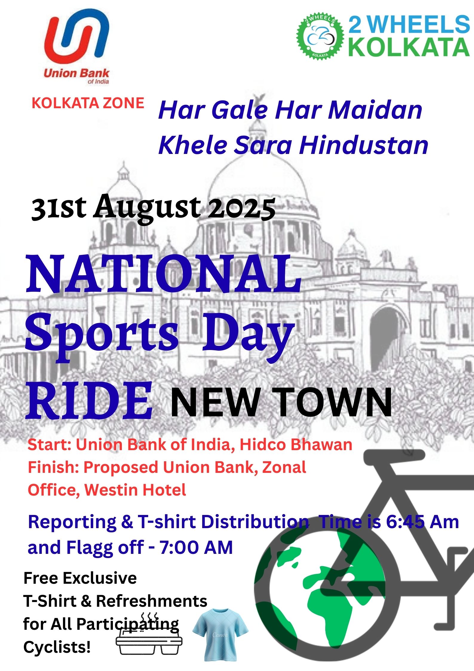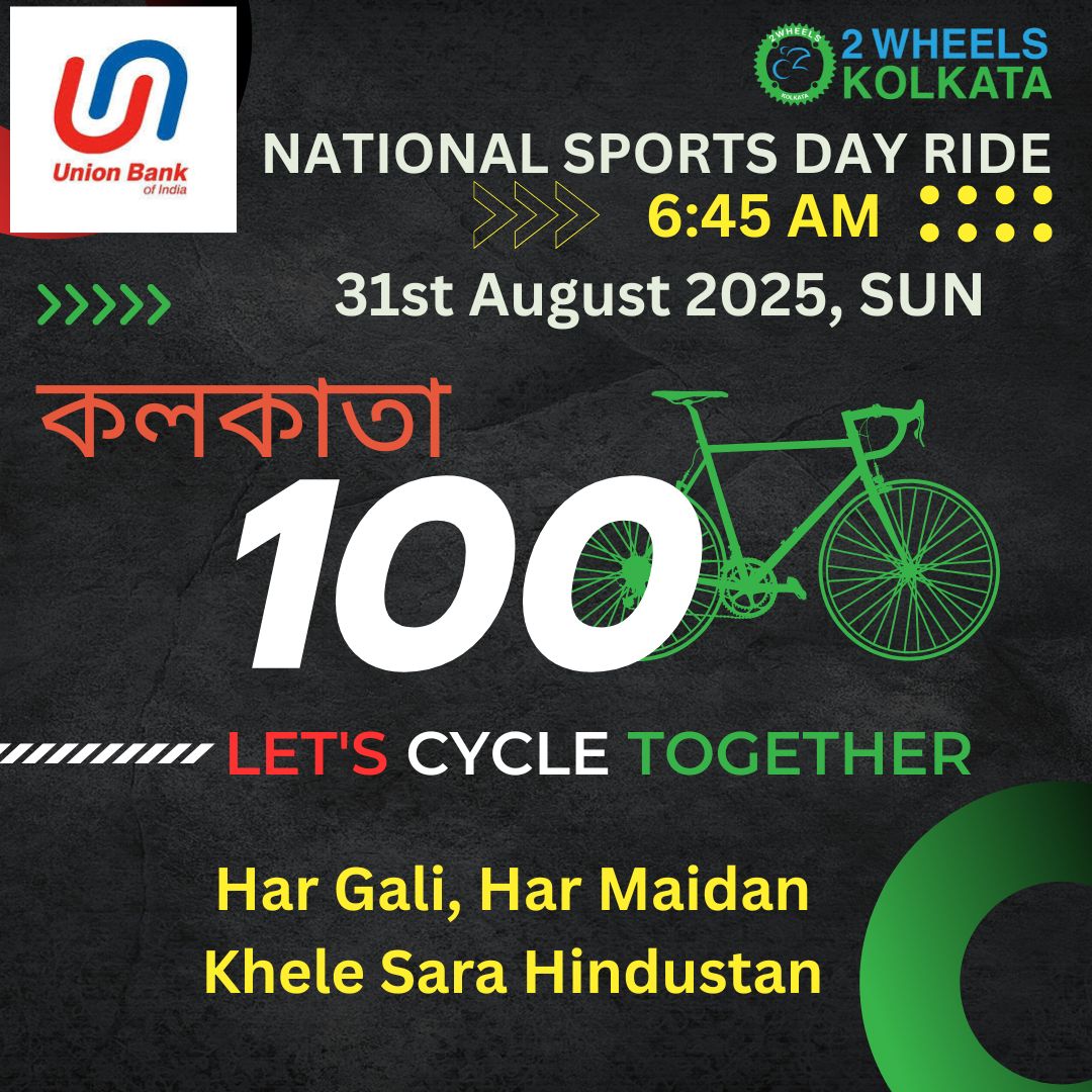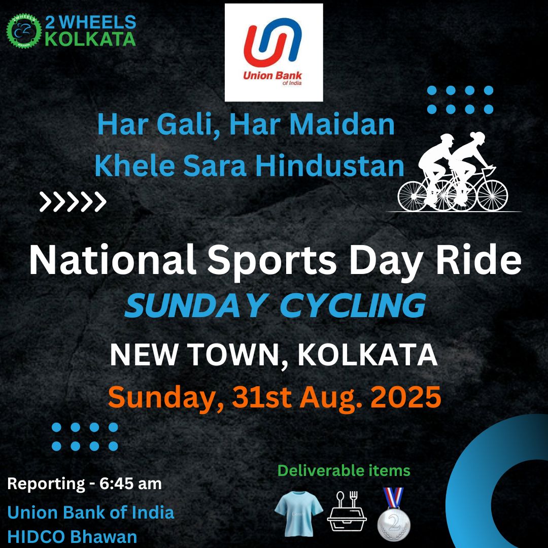 2WheelsKolkata Cycling Club or any of its affiliation, sponsors, organizers, volunteers, and / or any connected entities and / or persons for this event ”National Sports Day Ride 2025“ , will not be responsible, and / or liable, for any personal risk, injury, death, and / or loss of properties of self and / or third-parties. The participants for this event will be held solely responsible for all personal risk, injury, death, and / or loss of properties of self and / or third-parties.