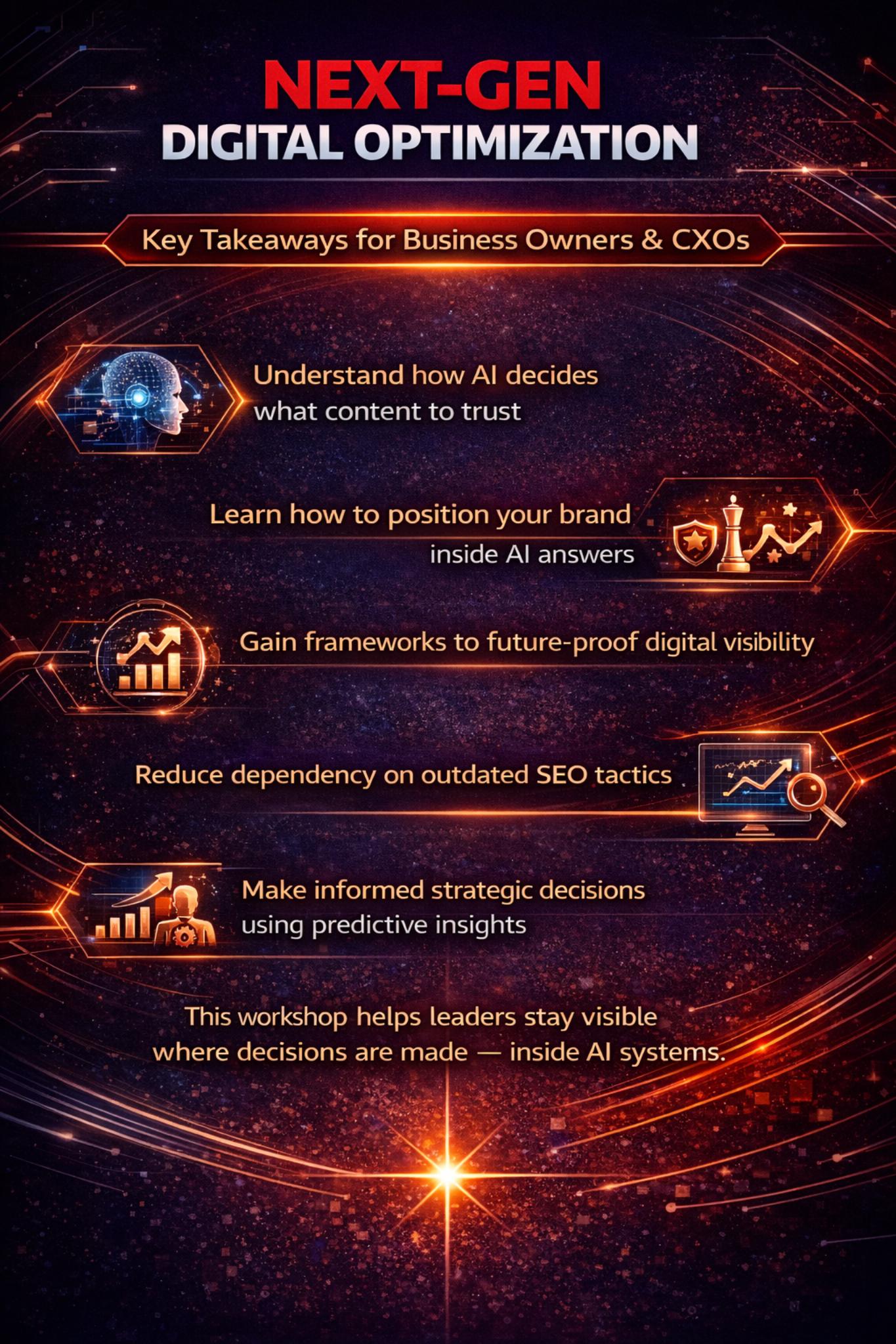 Next-Gen Digital Optimization is a strategic, hands-on masterclass designed to help business leaders and marketers adapt to the rapidly evolving AI-driven search landscape. This session goes beyond traditional SEO and dives into how artificial intelligence, machine learning, semantic search, and predictive intelligence are reshaping digital visibility and growth.