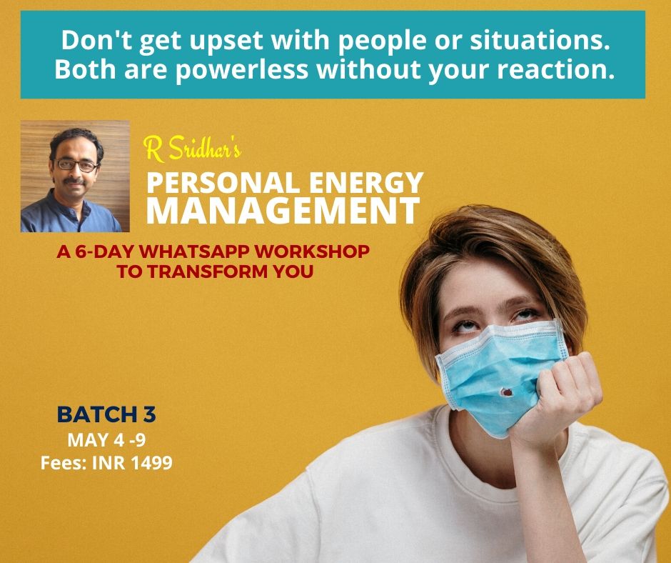 PERSONAL ENERGY MANAGEMENT is personal energy coach R Sridhar's signature course that teaches you to understand human energy in terms of vibrations, wavelengths and frequencies through a variety of exercises and experiences.