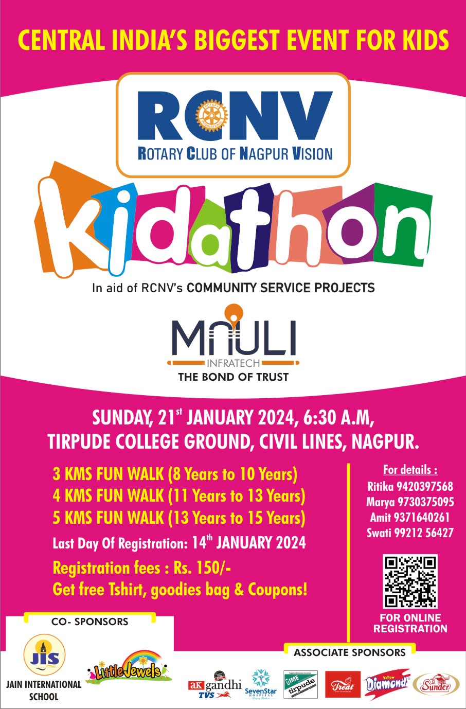 Rotary Club of Nagpur Vision in association with Mauli Infra Presents Kidathon in co-association with Jain International School, to promote healthy life style for kids between the age group of 8 to 15 Years. The event will start from Tirpude College Ground will be finish at the same location. There will be three categories as below
