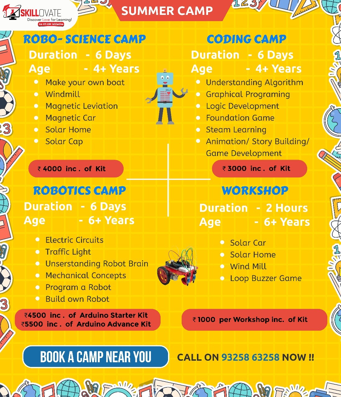 One Day Workshop: It will be 2 hours workshop in which kids learn about multiple concepts of science & create a robot at the end of workshop.