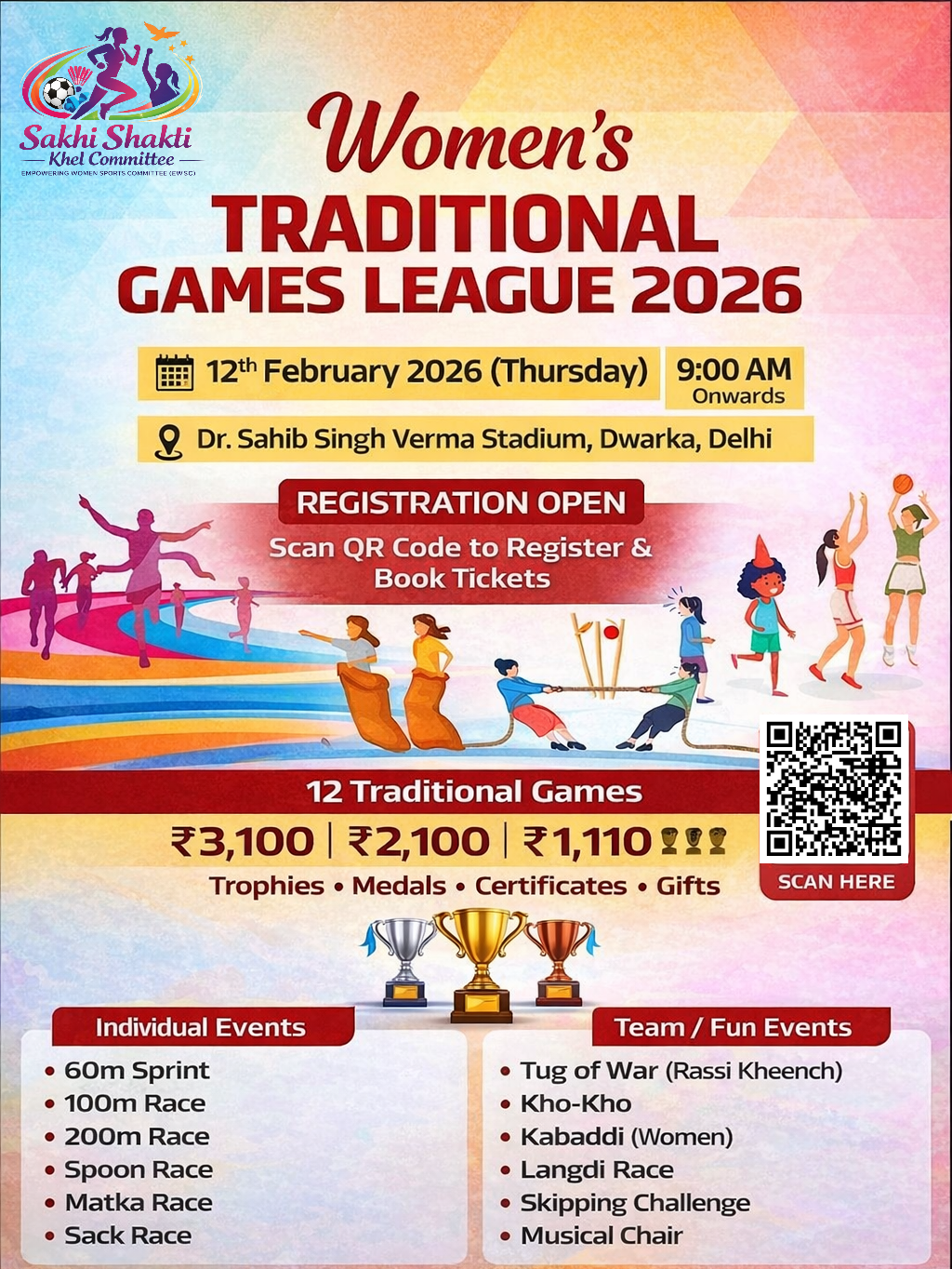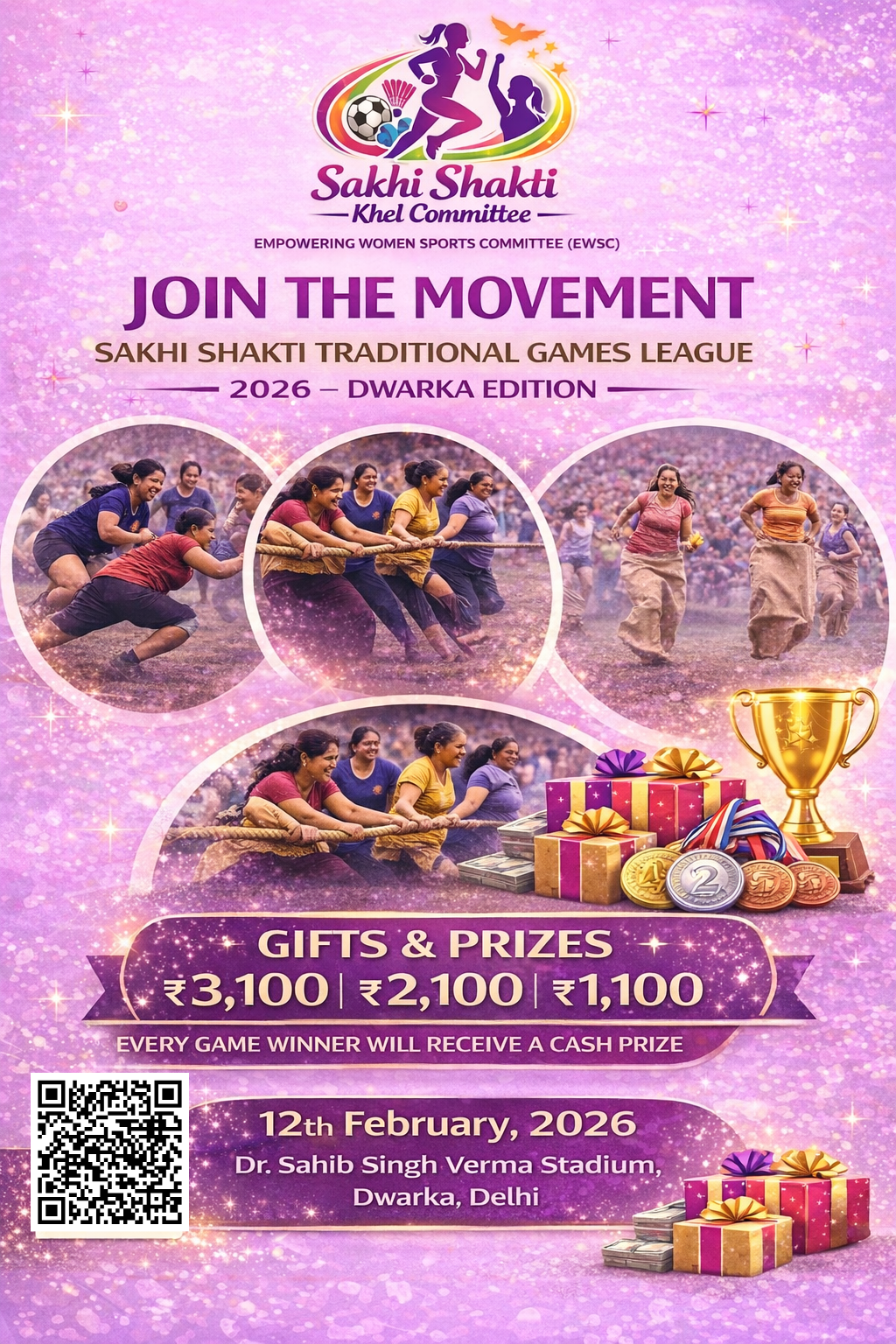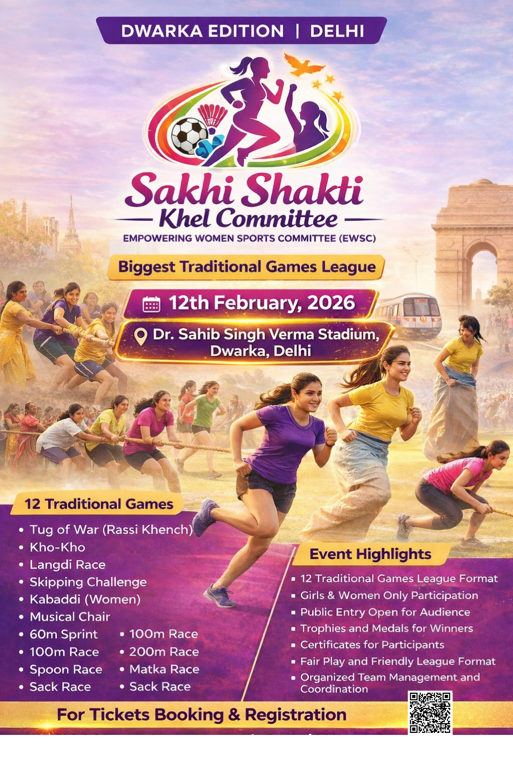 Sakhi Shakti Traditional Games League – Dwarka Edition is a women-focused traditional sports league created to promote women empowerment through participation, confidence, discipline, and community strength. This event is designed for girls and women to experience a respectful, well-organized and supportive sports environment through regional and traditional games.