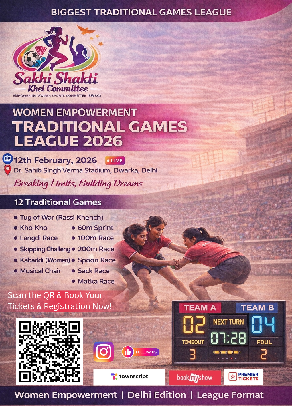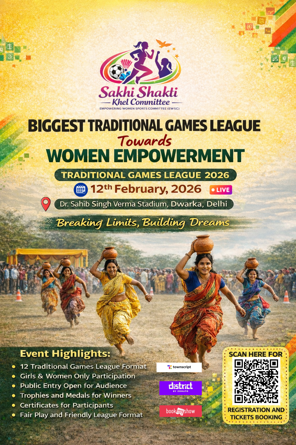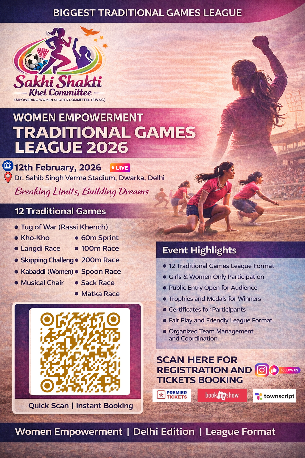 Sakhi Shakti Traditional Games League – Dwarka Edition is a women-focused traditional sports league created to promote women empowerment through participation, confidence, discipline, and community strength. This event is designed for girls and women to experience a respectful, well-organized and supportive sports environment through regional and traditional games.