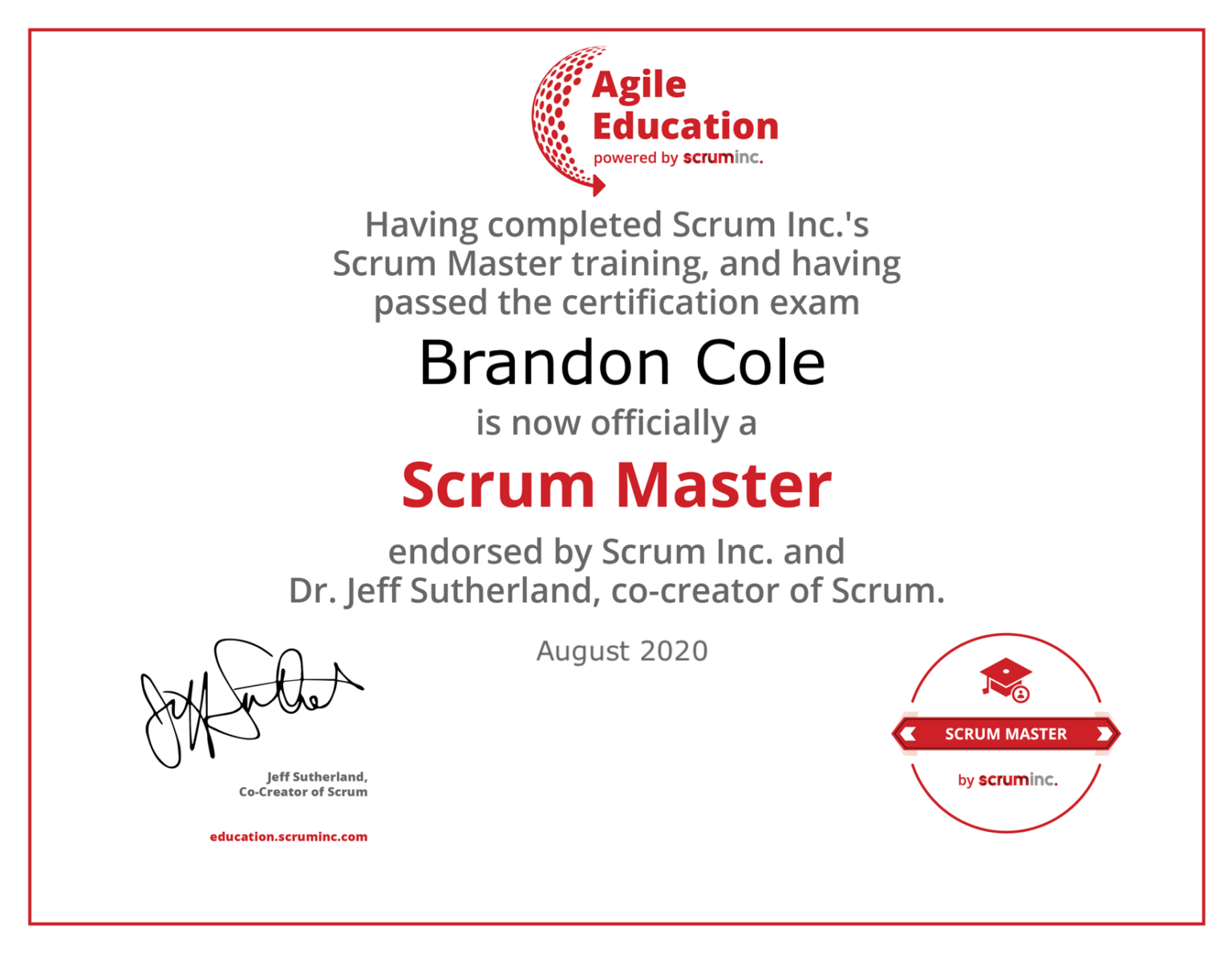 Students who complete a Scrum Master by Scrum Inc. training, comprised of at least 14 hours of live instruction time covering all Learning Objectives with a Scrum Inc. Trainer™ are eligible to take the Scrum Master by Scrum Inc. exam. Students who pass the exam will earn their Scrum Master by Scrum Inc.™ credential.