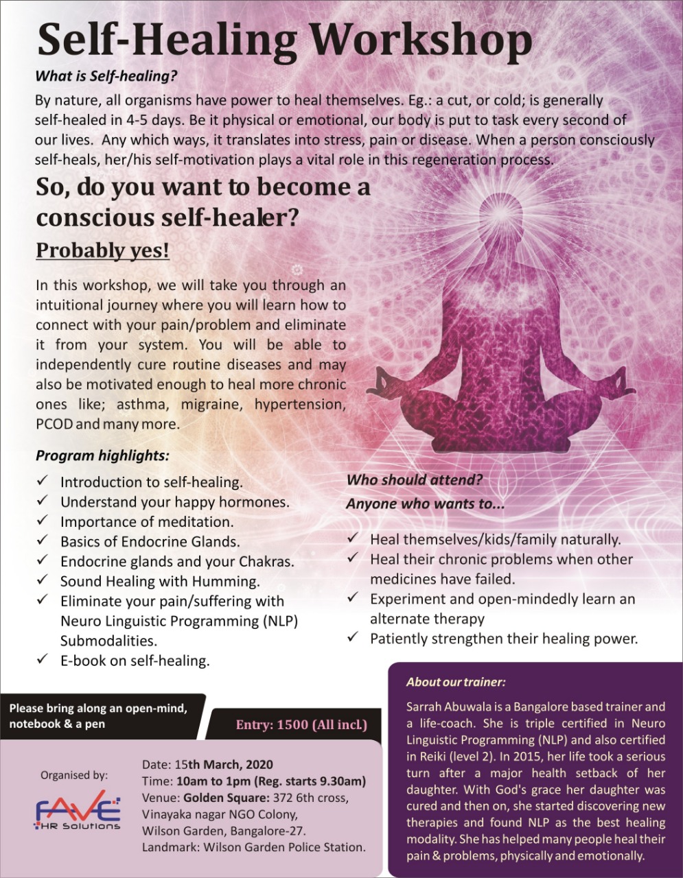 We are glad to present a Self-Healing Workshop for all individuals who want to learn an alternate therapy which can help dealing with pain, stress and emotional trauma.