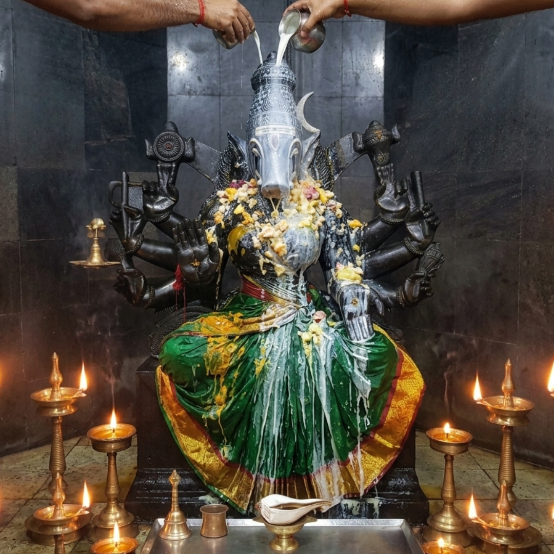 The Abhishekam (ritual bathing) is performed with sacred substances such as water, milk, turmeric, and other offerings, symbolizing purification, protection, and activation of divine energy. This process represents the removal of negative influences and the strengthening of spiritual power.
