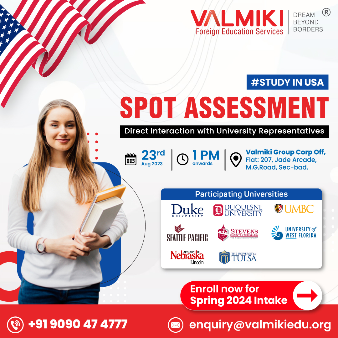 Spot Assessment for your application to study at USA, being held on 23rd August 2023, from 1:00 PM to 3:00 PM at Valmiki Head Office, Paradise. Attend to interact with university representatives and make a strong application!