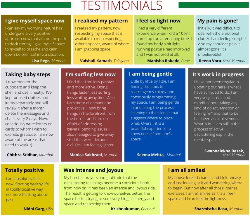That's because clutter management is NOT about decluttering. The decluttering process is just the operational part. What's more important is to know yourself first, identify how you are programmed, re-program yourself and then in a very systematic and scientific way, clutter each aspect of your existence - physical, emotional, mental, spiritual and digital.
