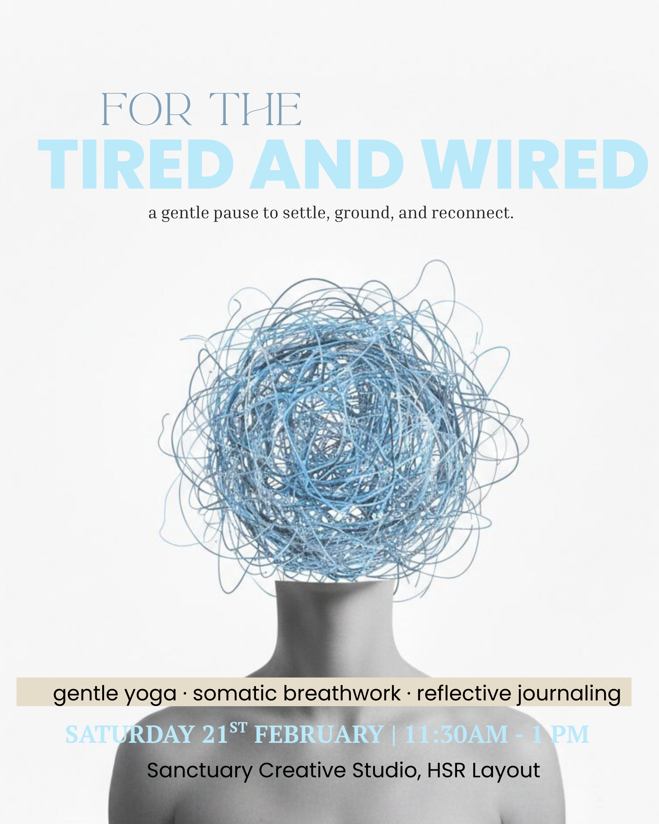 Tired & Wired is a 90-minute, slow and supportive experience designed for those moments when rest feels distant and the nervous system feels overstimulated. This workshop offers a gentle pause—to settle, ground, and reconnect with yourself.