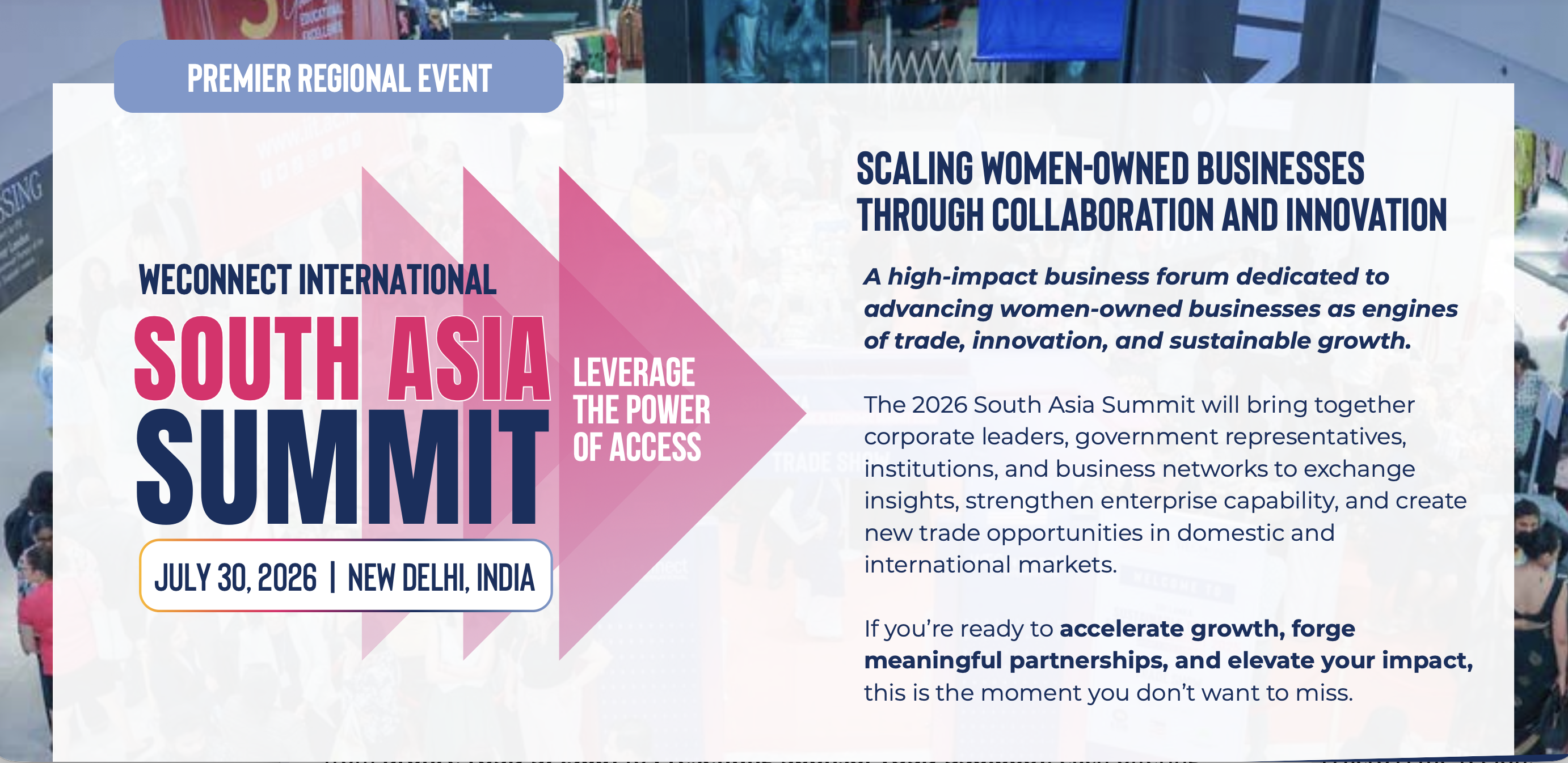 WEConnect International is proud to present the South Asia Summit 2026, a high-impact business forum focused on leveraging the power of access to accelerate growth for women-owned businesses across the region. As South Asia continues to expand its role in global value chains, access to corporate procurement, markets, capital, and strategic networks is critical to unlocking sustainable and inclusive economic growth.