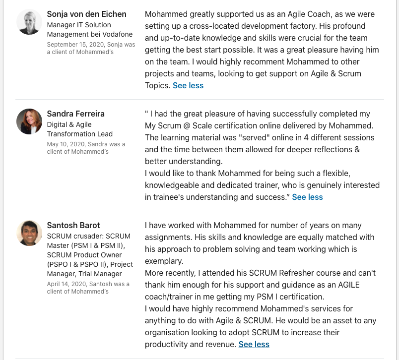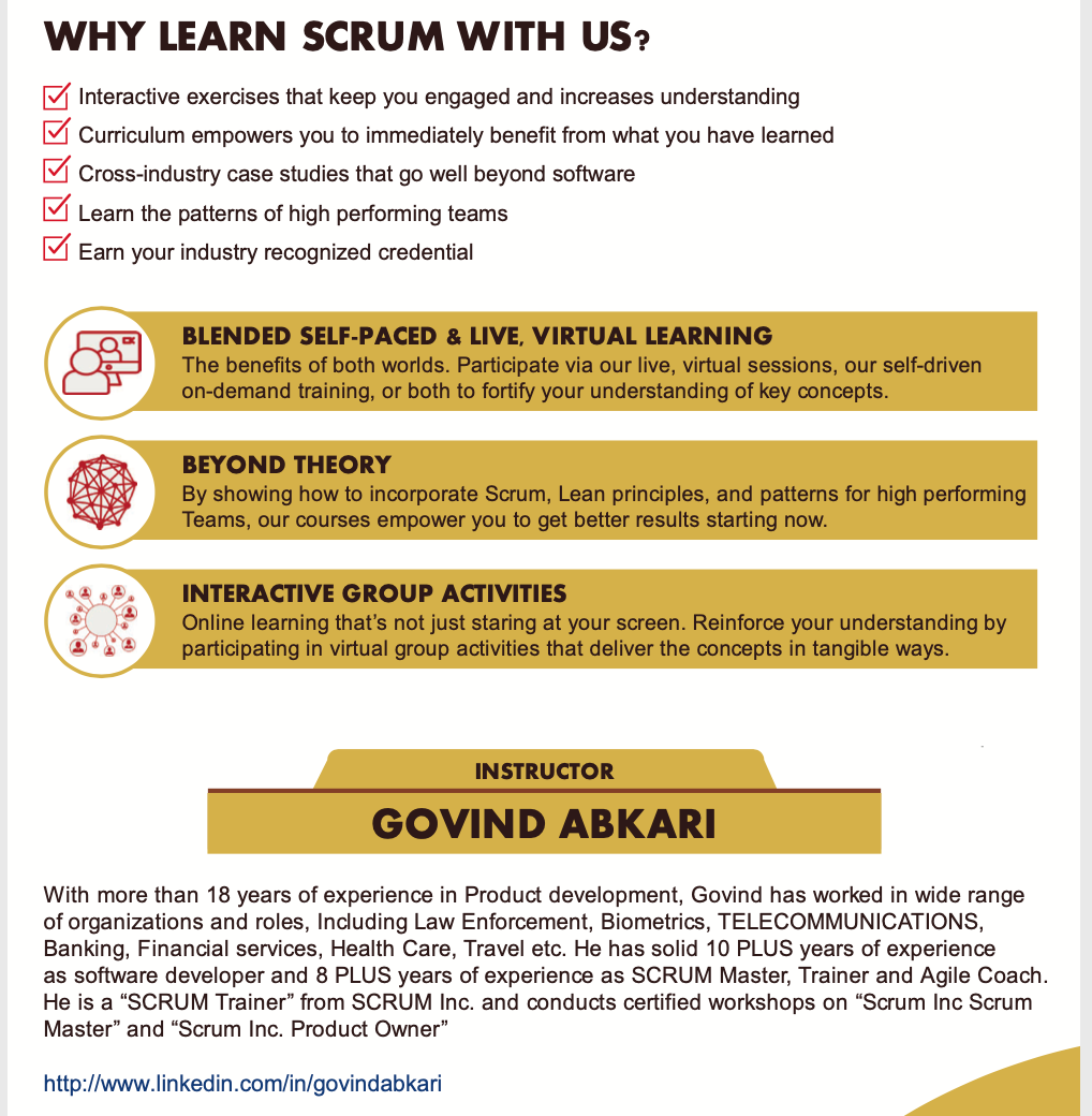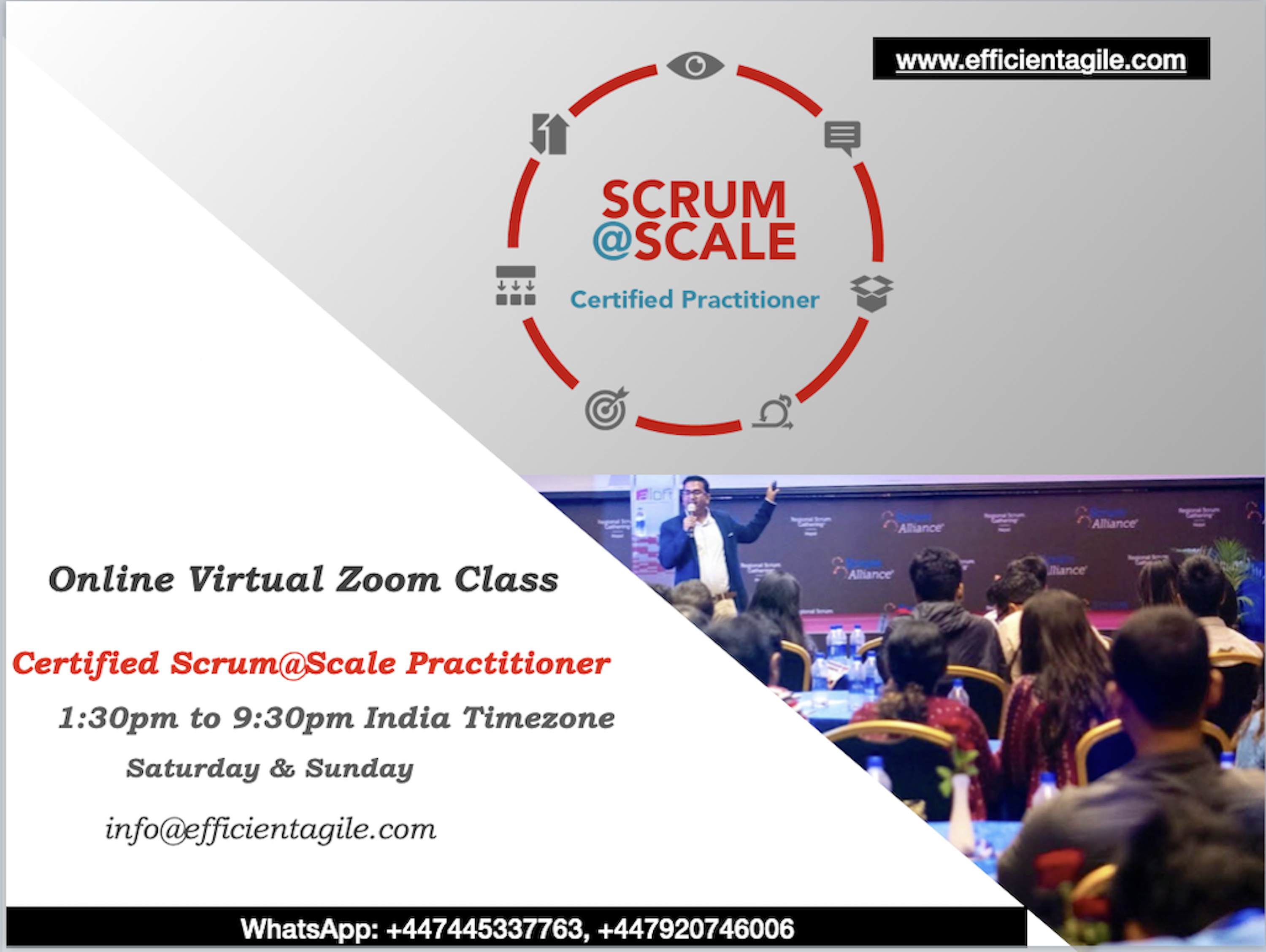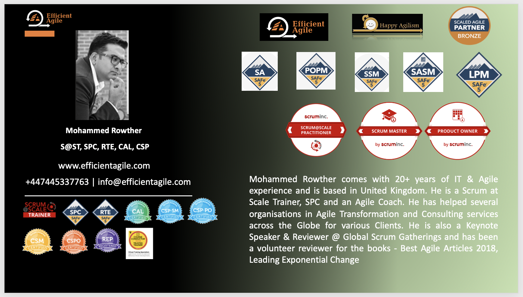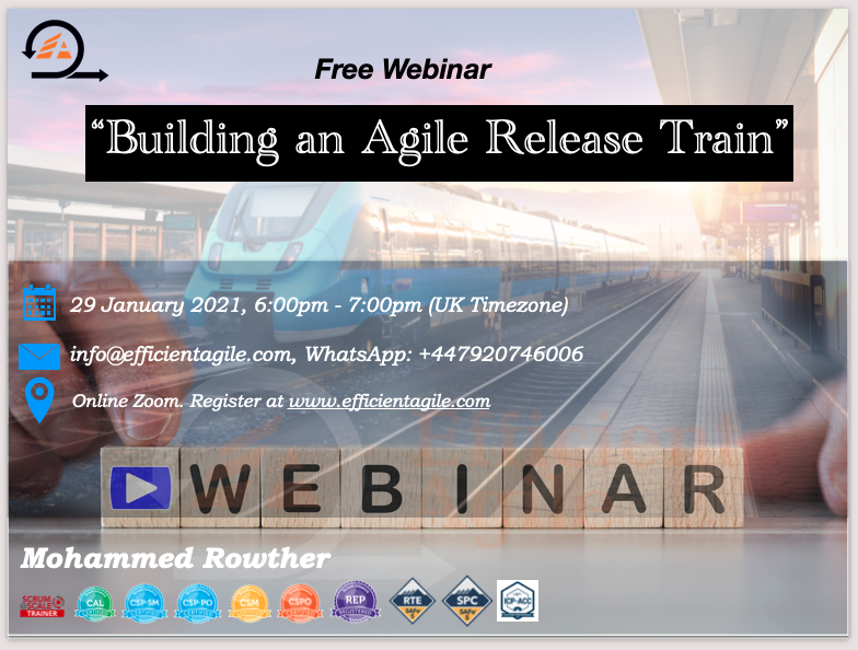 Efficient Agile offers Best Agile Training courses throughout the world. Our main focus is to provide the best value and outcome for all the learners. We offer SAFe, Certified Scrum@Scale, Scrum Foundations, Scrum Master Course, Product Owner, BDD, User Story, and Leadership Workshops. Get in touch.